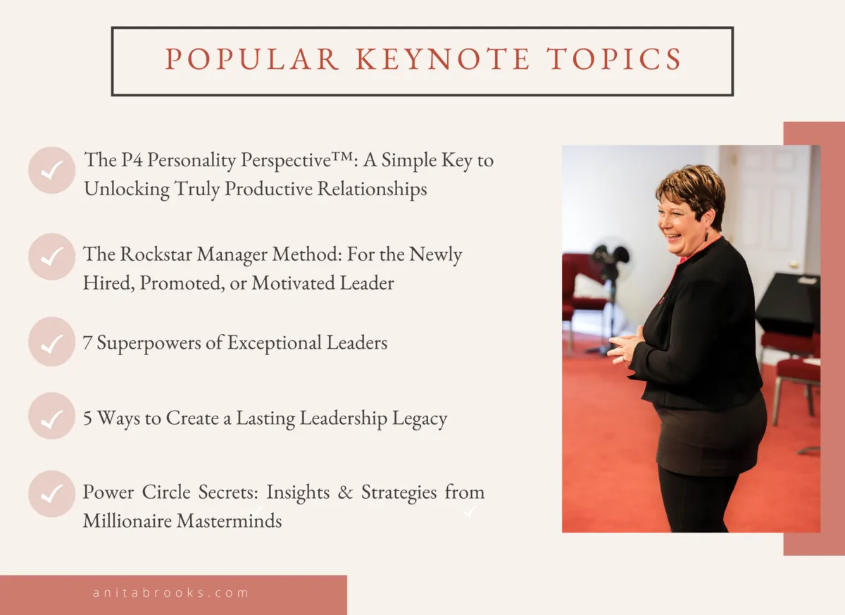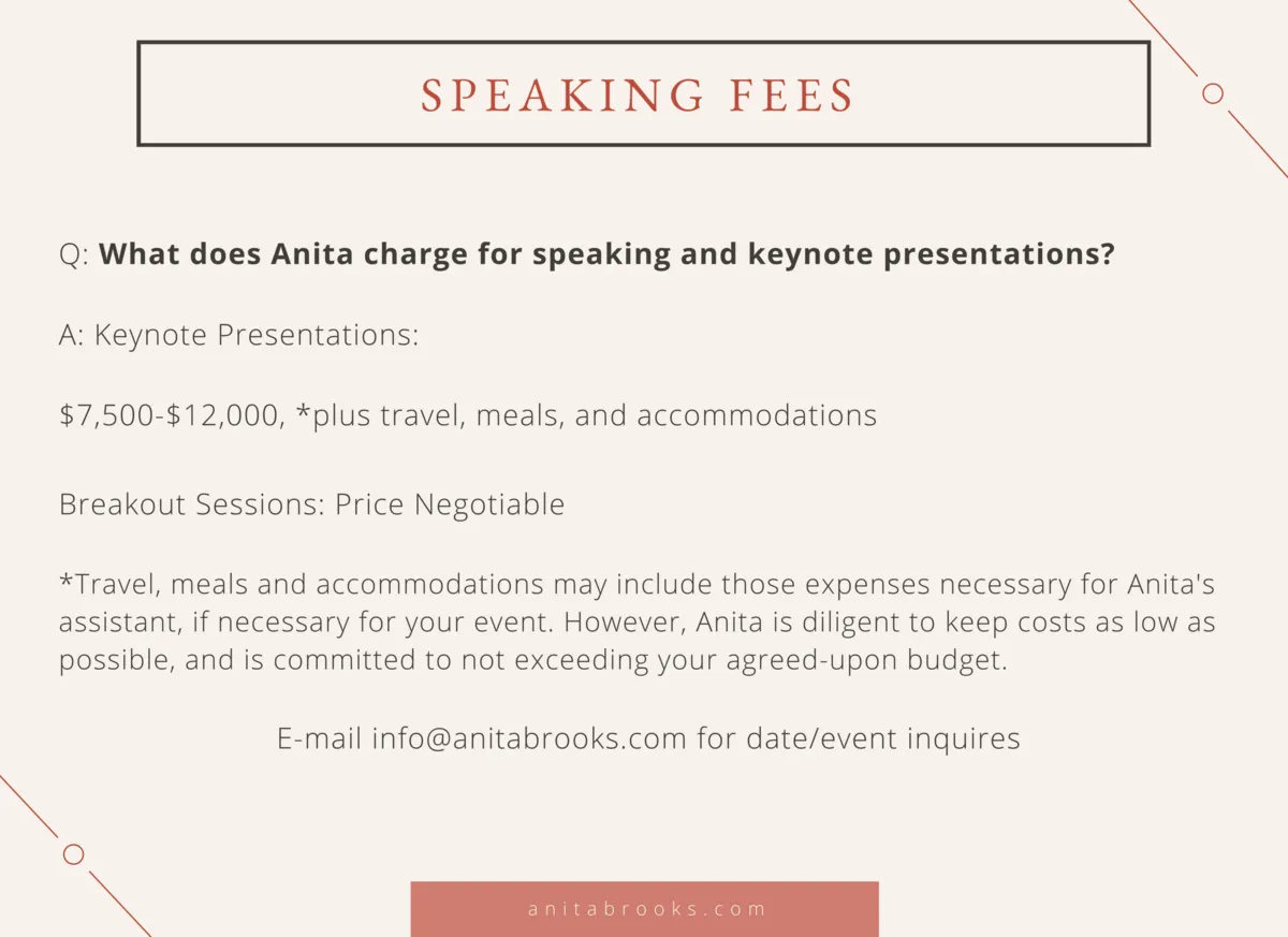 Anita Brooks is a dynamic speaker who brings education and experience to your organization (not stuff and fluff), but she is also relational and inspirational by personality.
